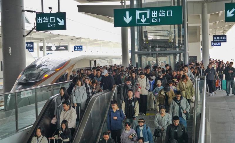 4月4日,在浙江省温州北站,抵达的乘客提着行李有序离开站台。新华社发(苏巧将摄)